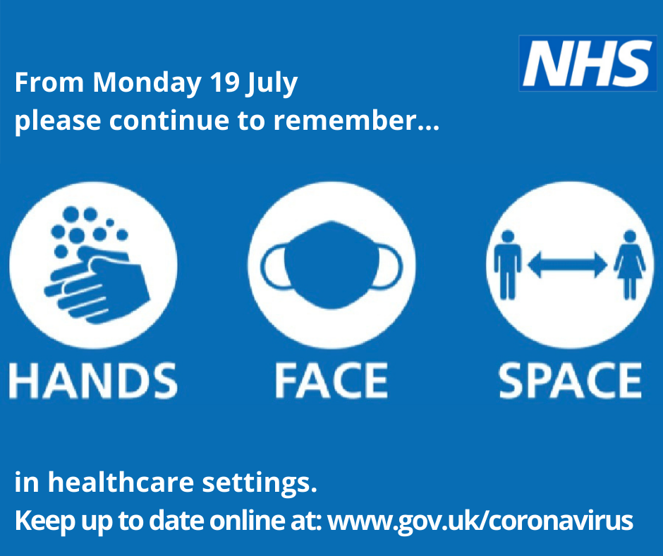 Anyone visiting any healthcare setting from Monday 19 July is being urged to remember Hands > Face > Space.